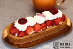 Verse aardbeien en aardbeibavaroise op een koekbodem met amandelspijs.